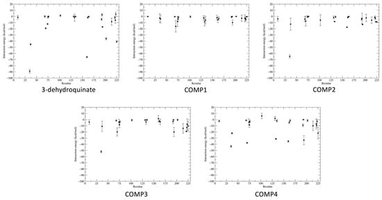 Interaction energy (kcal/mol) between the substrate and each potential inhibitor with residues at 5 Å in the binding site. The residue number and interaction energy values are shown in x and y-axes, respectively. Each point indicates the mean ± SD.
