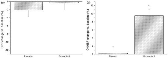 Dronabinol and optic nerve head blood flow in healthy subjects. On the left side (a), the relative changes in OPP after administration of placebo and dronabinol (−2.1 ± 8.4% vs. −0.4 ± 8.2%, respectively, p = 0.48 between study days) are shown. On the right side (b), the relative change in optic nerve head blood flow (ONHBF) at rest was increased by 9.5 ± 8.1% after dronabinol intake (p < 0.001). Data are presented as mean ± SD (n = 24). * Significant changes vs. baseline. “Reprinted from Ref. [188]. This work is licensed under the Creative Commons Attribution 4.0 International (CC BY 4.0) license. To view a copy of this license, visit http://creativecommons.org/licenses/by/4.0/”.