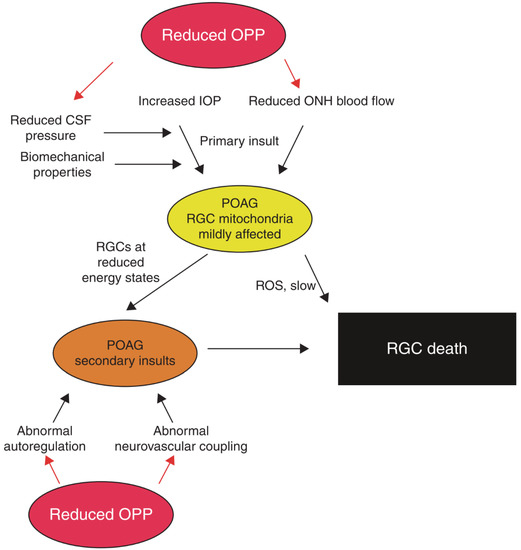 This overview shows the primary and secondary insults in glaucoma pathogenesis influenced by reduced ocular perfusion pressure (OPP). Elevated intraocular pressure (IOP) and optic nerve head (ONH) ischemia lead to the primary insult at the optic nerve head. Biomechanical properties of ocular tissues and reduced cerebrospinal fluid (CSF) can alter susceptibility. In patients with primary open-angle glaucoma (POAG), retinal ganglion cells (RGCs) then exhibit reduced energy states as the mitochondria are affected. The combination of oxidative stress caused by reactive oxygen species (ROS) and secondary insults, like abnormal autoregulation and abnormal neurovascular coupling, may lead to RGC death, which is the end of the pathway. “Reprinted with permission form Ref. [14]. 2013, Elsevier”.