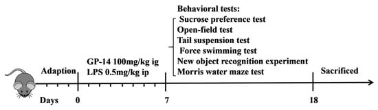 The C57BL/6J mice (male, 8 weeks of age) were purchased from the Laboratory Animal Center of Vital River Experimental Animal Company (Beijing, China). The animals were maintained under controlled conditions (12 h light/12 h dark cycle; temperature, 23 ± 2 °C; relative humidity, 50%–60%), which included free access to standard rodent chow and water. After 3 days of acclimatization, animals were randomly divided into four groups: control group (n = 10), LPS group (n = 10), GP-14 group (n = 10), and GP-14 + LPS group (n = 9). GP-14 was provided by the Lanzhou Institute of Chemical Physics (LICP). The dose of LPS was chosen according to the method reported previously []. GP-14 was suspended in a 0.5% sodium carboxymethyl cellulose solution. GP-14 was administered via intragastric gavage daily. The control group was given 0.5% sodium carboxymethyl cellulose solution via gavage daily. Mice were gavaged every day at 8:00 a.m. and were intraperitoneally injected with 0.5 mg/kg LPS (Cat. no. L2630, Sigma-Aldrich, St. Louis, MO, USA) at 4:00 p.m. Behavioral tests were performed on the same group of mice 24 h after the last LPS injection. After being perfused with chilled sterile PBS, the brains were extracted cautiously, and serum and hippocampus samples were promptly gathered and preserved at −80 °C until required for subsequent experimentation. Diagram of the behavioral experimental design is shown in Figure 1.
