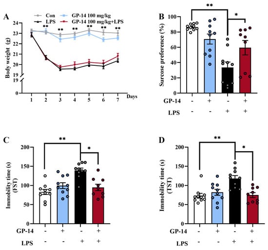 In our previous studies, GP-14 of 100 mg/kg and 200 mg/kg were used to treat LPS-induced high-altitude cerebral edema. GP-14 at 100 mg/kg significantly alleviated neuroinflammation and blood brain barrier (BBB) disruption in a mouse HACE model []. Therefore, the dosage of GP-14 100 mg/kg was selected to conduct the present experiment. Firstly, we analyzed the changes in body weight between groups of mice to determine whether GP-14 might influence depression induced with LPS. Figure 1 shows, mice were treated for 7 days with LPS injection along with GP-14 gavage administration. Compared with the control group, the LPS group mice revealed a significant decrease in the first three days and gradually increased in the following days. However, the mice subjected to LPS induction did not exhibit any significant changes in body weight following the administration of GP-14 at a dosage of 100 mg/kg (Figure 2A).