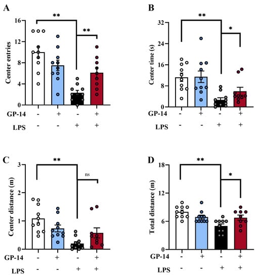 The effect of GP-14 anxiety-like behavior in the LPS-induced model. (A) Center entries in the OFT. (B) Center time in the OFT. (C) Center distance of the central area. (D) Total distance in the open field test. The results were presented as mean ± SEM (n = 9−10/group). * p < 0.05, ** p < 0.01. ns means no significant difference.