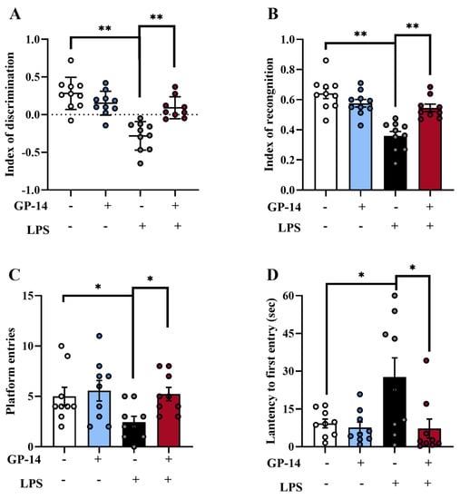 The effect of GP-14 on learning and memory in LPS-induced depression. (A) The discrimination index of novel object recognition was detected (n = 9−10/group). (B) The cognitive index of novel object recognition was evaluated (n = 9−10/group). (C) The mean number of platform entries was detected during MWM (n = 9/group). (D) The latency to first entry was recorded with MWM (n = 9/group). The results were presented as mean ± SEM. * p < 0.05, ** p < 0.01.