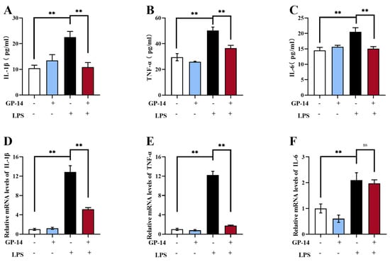 C8 cells were obtained from the Cell Resource Center of the Chinese Academy of Medical Sciences (Beijing, China). DMEM was used to culture the C8 cells, which contained 10% (v/v) fetal bovine serum (FBS, Gibco, Waltham, MA, USA). After seeding cells in cell culture plates, C8 cells were pretreated with 30, 60, and 90 μM GP-14 for a duration of 6 h. Subsequently, the cells were treated with LPS for another 6 h. Following cell collection, qPCR and western blotting were performed.