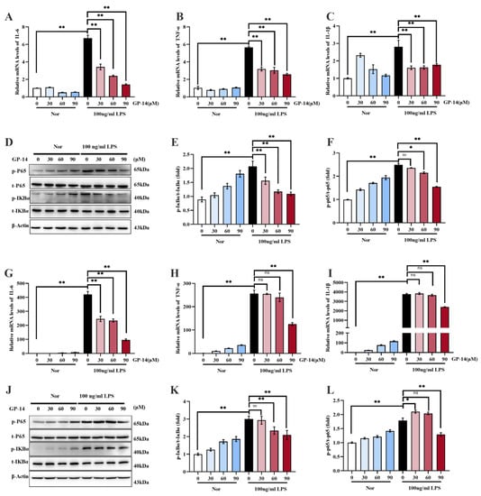 The effect of GP-14 on the NF-κB signaling pathway in C8 cells and primary astrocytes. (A–C) The C8 cells were subjected to various concentrations of GP-14 for a duration of 6 h. Subsequently, the cells were exposed to 100 ng/mL of lipopolysaccharide (LPS) for another 6 h, with some cells being left untreated. QPCR measured the levels of IL-6, IL-1β, and TNF-α. (D) Protein bands of phosphorylated IκBα (p-IκBα), phosphorylated p65 (p-p65), total-IκBα (t-IκBα), total-p65 (t-p65), and β-actin in C8 cells. (E,F) Quantification of protein bands for phosphorylated-IκBα and phosphorylated-p65 in C8 cells. (G–I) The primary astrocytes were treated with different doses of GP-14 for 6 h, followed by treatment with or without 100 ng/mL of LPS for 6 h. The levels of IL-6, IL-1β, and TNF-α were measured in primary astrocytes using qPCR. (J) Protein bands of phosphorylated IκBα (p-IκBα), total IκBα (t-IκBα), phosphorylatedp65 (p-p65), total-p65 (t-p65), and β-actin in primary astrocytes. (K,L) Quantification of protein bands of phosphorylated IκBα (p-IκBα) and phosphorylated p65 (p-p65) in primary astrocytes. The results are expressed as the mean ± SEM (n = 3), * p < 0.05, ** p < 0.01. ns means no significant difference.