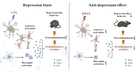 Model showing the role of GP-14 in LPS-induced depression-like behaviors in mice. GP-14 reduces depression-like behavior in mice by inhibiting astrocytes activation and decreases levels of pro-inflammatory factors.