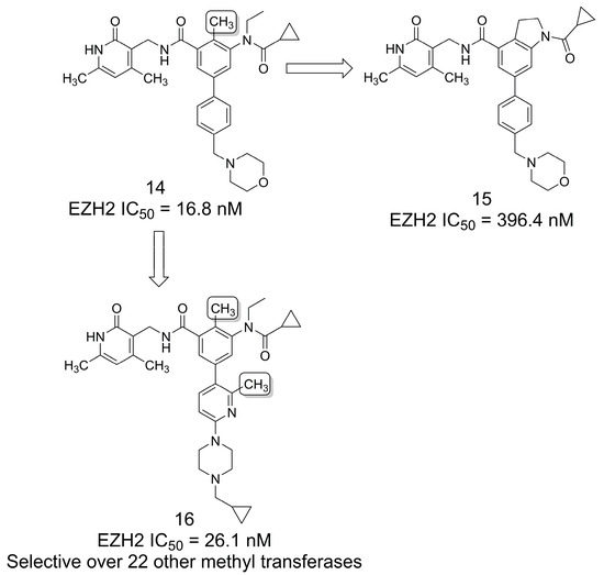 Aiming to obtain new selective EZH2 inhibitors related to tazemetostat (8), the authors of [19] first tried to perform the cyclization of compound 14 by linking the methyl and ethyl groups to form an indoline ring (15) (Figure 2). However, it was observed that this modification led to a loss in potency against the EZH2 wild-type enzyme and the EZH2 Y641F mutant. The authors suggest that the cyclization abolished the “magic methyl” effect previously reported to be key to the FDA-approved drug 8. Therefore, the authors selected the open-ring analog (14) for further structure–activity relationship (SAR) exploration, resulting in compound 16, a derivative with a second methyl group at the pyridine ring that showed selectivity over 22 other methyl transferases [19].