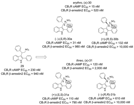 Garai and colleagues [32] employed the magic methyl effect to increase the potency and efficacy of GAT211 (29) [33], a cannabinoid type-1 receptor (CB1R) agonist-positive allosteric modulator (ago-PAM) (Figure 7). The strategic placement of a methyl group at the alpha position of the nitro functional group was hypothesized to be advantageous in terms of activity and functional selectivity, as it generated two diastereomers and an additional chiral center. Results from studies with the two diastereomers highlighted the increased potency and efficacy of erythro, (±)-30 compared to threo, (±)-31. The analysis of the separate enantiomers highlighted (−)-(S,R)-30a and (+)-(S,S)-31a as the most potent. This result represents the first example of a diastereoselective CB1R allosteric modulator interaction [32].