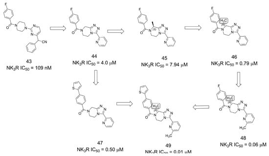 The discovery of new neurokinin-3 receptor (NK3R) antagonists for the treatment of sex hormone disorders was described [42]. Starting with an HTS campaign, hit 43 was identified as an interesting starting point for optimization, but several issues such as poor solubility, microsomal stability, and off-target safety profile led to the selection of the parent compound 44 as the starting point (Figure 12). Despite being significantly less active, 44 presented improved off-target and PK profiles, making it more suitable for optimization. From the SAR analysis, it was possible to perceive the methylation effect by installing a methyl group at the 8-position of the tetrahydro-[1,2,4]triazolo[4,3-a]pyrazine core, where (R)-46 presented increased potency, reaching the nanomolar scale. A second methylation at C6 of the terminal pyridine ring further increased potency, resulting in low nanomolar activity (48 and 49) [42].