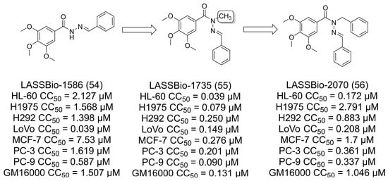 Barbosa and colleagues [46] described a series of combretastatin A-4 analogs based on the N-acylhydrazone (NAH) LASSBio-1586 (54) with cytotoxic and antimitotic activity (Figure 14). Homologation [9] studies on the amide nitrogen led to the benzyl homolog of LASSBio-1586 (54), LASSBio-2070 (56), which showed microtubule-stabilizing behavior, while the methylated homolog, LASSBio-1735 (55), had microtubule-destabilizing behavior. In addition, none of the compounds had better cytotoxic activity when compared to the N-methylated compound LASSBio-1735 (55) [46].