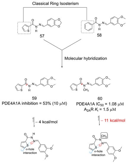 The methylation effect was also shown to have an impact on multitarget small molecule discovery. The compounds (59 and 60) were designed through molecular hybridization [47] and bioisosteric replacement [7] strategies using 57 and 58 as starting points (Figure 15). As previously reported, 57 is an adenosine A2A receptor agonist [48], and 58 is a phosphodiesterase 4 (PDE4) inhibitor [49]. Insertion of the methyl group at the amide nitrogen of the N-acylhydrazone (60) moiety significantly increased the percent inhibition of PDE4A1A compared to the non-methylated analog (59). Further evaluation showed that 60 had an IC50 of 1.08 µM for PDE4A1A inhibition and a moderate affinity for the adenosine A2A receptor (Ki = 1.5 µM), making this compound interesting for the treatment of pulmonary arterial hypertension. Regardless of the presence of methyl, there is a σ-hole intramolecular interaction between the sulfur atom of the thiophene ring and the nitrogen atom of the imine, which establishes the bioactive conformation for the system, as already described for N-acylhydrazone derivatives [50,51]. However, with the N-methylation of the amide, there is a greater stabilization of this conformation and, consequently, an improvement in biological activity (Figure 15) [50].