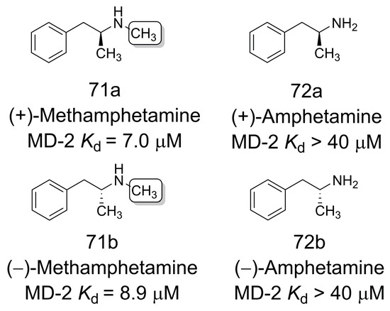Zhang and coworkers [60] demonstrated that Toll-like Receptor 4/Myeloid Differentiation Protein 2 (TLR4/MD-2) complex [61,62] recognizes methamphetamine (71a and 71b) non-enantioselectively, whereas amphetamine (72a and 72b) is inactive. Compared to amphetamine (72) (MD-2 Kd not detectable up to 40 μM), the increased TLR4/MD-2 binding affinity of methamphetamine ((+)-71a MD-2 Kd = 7.0 μM; (−)-71b MD-2 Kd = 8.9 μM) suggests that the methyl group is essential for molecular recognition (Figure 19). Molecular dynamics simulations (20 ns) and binding free energies determined by the MM-PBSA technique indicated that (+)-71a and (−)-71b had comparable binding free energies. Further energy analysis revealed that hydrophobic interactions are predominantly responsible for the binding of methamphetamine/amphetamine to TLR4/MD-2 [60].