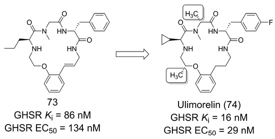A key example is the discovery of ulimorelin (74), a compound that has reached Phase 3 clinical trials. Ulimorelin (74) acts as an agonist of the human ghrelin receptor (also known as the growth hormone secretagogue receptor—GHSR) and has gastroprokinetic properties. The development of 74 was initiated by an HTS campaign that led to the identification of 73 (Figure 20). Despite its high potency, 73 did not show adequate pharmacokinetic properties, and modification of the macrocycle methylation pattern helped to stabilize the bioactive conformation of this compound, resulting in the discovery of ulimorelin (74), which was four- to fivefold more potent for receptor activation and showed minimally adequate pharmacokinetic properties to enter the clinical phase [65]. It is important to note that during the SAR investigation, the side chain modification of isoleucine to cyclopropyl and the introduction of para-fluor on the phenyl ring of 74 did not significantly affect the affinity of the compound. The authors reported that cyclopropyl is more metabolically stable than the side chain of isoleucine and that para-fluor resulted in an optimization of the ligand lipophilicity efficiency (LLE) [65].