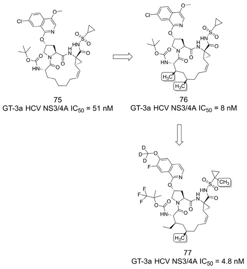 The results reported by Sun and colleagues [66] highlight the effect of the methyl group in improving bioavailability following oral administration to rats of pan-genotype NS3/4A protease inhibitors for the treatment of hepatitis C virus infection [67]. First, the authors incorporated two methyl groups on 75 (IC50 = 51 nM) to produce 76, a compound with improved activity (IC50 = 8 nM) against the genotype 3a (GT-3a) NS3/4A protease (Figure 21). Based on this compound, a series of macrocycles were designed to obtain a better in vivo profile. The authors addressed the metabolic liability of 76 by exploring the deuteration strategy and highlighted that an optimal profile was obtained by incorporating a CF3 into the Boc group and an additional methyl next to the polar acylsulfonamide moiety (77, IC50 = 4.8 nM). These modifications led to improvements in both in vivo distribution and metabolic stability [66].