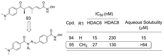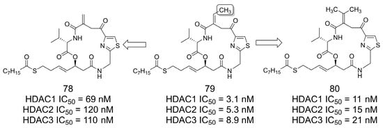 The authors of [68] investigated the impact of the presence of the methyl group in the design of selective Class I HDAC inhibitors as interesting candidates for cancer treatment. For example, in the macrocyclic prototype 79 (HDAC1-3 range of IC50 = 3.1–8.9 nM) [69], removal of the methyl group from the propenyl group resulted in compound 78 (Figure 22). Removal of the methyl group (78) was detrimental, resulting in IC50 activities in the range of 69–110 nM (HDAC1-3). When a second methyl group was added (80), a small decrease in the inhibitory activity was observed (HDAC1-3 range of IC50 = 11–21 nM). Theoretical modeling studies suggested that the binding pocket better fits the dehydrobutyrine moiety of 79, which contains only one methyl group in the olefin subunit and seems to be important for the inhibition of HDACs from Class I [68].