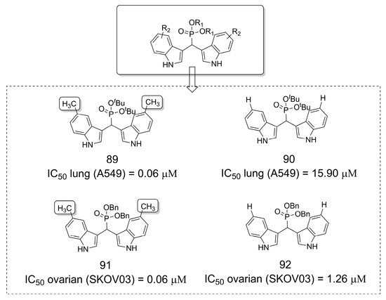 - Maestro, A.; Martín-Encinas, E.; Alonso, C.; Martinez de Marigorta, E.; Rubiales, G.; Vicario, J.; Palacios, F. Synthesis of Novel Antiproliferative Hybrid Bis-(3-Indolyl)Methane Phosphonate Derivatives. Eur. J. Med. Chem. 2018, 158, 874–883. [Google Scholar] [CrossRef]