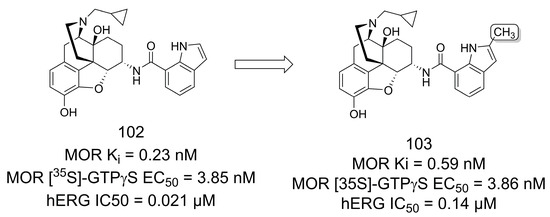 In another study, Ma and colleagues [78] designed analogs of the mu opioid receptor (MOR) ligand NAN (102) [79], a 6α-N-7′-indolyl-substituted naltrexamine derivative, which showed promising pharmacological effects but had significant hERG potassium channel liability (Figure 29). According to in vivo morphine-induced antinociception assays, compound 103 was the most potent antagonist. This compound (103) bears a methyl group at the 2′ position of the indole ring and had a sevenfold lower potency for hERG potassium channel inhibition compared to NAN (101) [78].