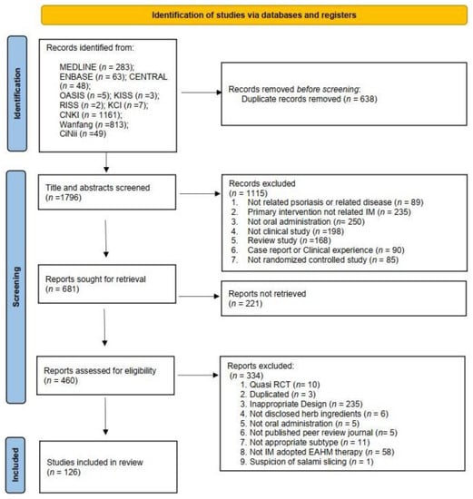 RCTs that evaluated the efficacy and safety of IM for psoriasis vulgaris were searched in the following 10 electronic databases from their inception until 29 July 2021: three English databases (PubMed, Cochrane Library, and Embase), four Korean databases (Korean Studies Information Service System, Research Information Service System, Oriental Medicine Advanced Searching Integrated System, and Korea Citation Index), two Chinese databases (Chinese National Knowledge Infrastructure Database, Wanfang data), and one Japanese database (Citation Information by National Institute of Informatics). The overall literature search procedure was carried out independently by two researchers (HGJ and HK). Detailed search strategies are presented in Supplementary Table S1.