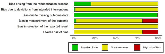 The methodological quality of the 126 included studies is summarized in Figure 3 and Table 2. The risk of bias in the studies was assessed using the Rob 2.0 tool [67]. In 101 studies, the overall risk of bias, in one or more domains, was evaluated to be of “some concern”. In all other studies, the overall risk of bias was evaluated to be “high”. Twenty-six studies reported detailed information on the randomization process, and only five studies explicitly revealed that a single-blind design was adopted [129,152,161,163,202]. In the remaining studies, it was difficult to obtain specific information other than the fact that randomization was performed, and the adoption of a blinded design was uncertain. In addition, a potential common factor that could affect the risk of bias was the absence of a preregistered protocol that could prevent selective outcome reporting.