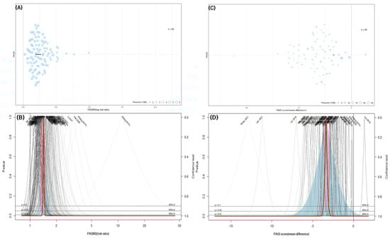 (A) Orchard plot of the trials that compared IM with CM for the PASI 60; (B) Drapery plot of the trials that compared IM with CM for the PASI 60; (C) Orchard plot of the trials that compared IM with CM for the PASI score; (D) Drapery plot of the trials that compared IM with CM for the PASI score. The red line in the drapery plot is the P-value curve of the pooled estimates; the light blue region in the drapery plot is the prediction region.