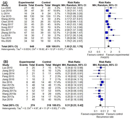 A meta-analysis was performed on 96 studies that reported PASI 60. The combined effect of IM on the response rate was significantly better than that of the CM control (96 trials, n = 8367; RR: 1.4280; 95% CI: 1.3783–1.4794; p < 0.0001, heterogeneity chi-square = 118.79, df = 95, I2 = 20.0%; p = 0.0498; Figure 4A,B).