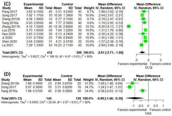In the 13 studies comparing the effect of IM with that of the CM control, IM exhibited a significantly improved PASI 70 compared to the CM control (13 trials, n = 1276; RR: 1.4994; 95% CI: 1.3208–1.7021; p < 0.0001; heterogeneity chi-square = 19.82, df = 12, I2 = 39.5%; p = 0.0705; Figure 5A). Twelve studies compared IM with CM controls regarding the recurrence rate. The combined effect of IM on the recurrence rate was significantly lower than that of the CM control (12 trials, n = 692; RR: 0.3095; 95% CI: 0.2256–0.4245; p < 0.0001, heterogeneity chi-square = 4.97, df = 11, I2 = 0%; p = 0.9325; Figure 5B). In the ten studies comparing the effect of IM with the CM control, IM significantly improved the DLQI compared to the CM control (10 trials, n = 811; MD: −2.6072; 95% CI: −3.7100 to −1.5043; p < 0.0001, heterogeneity chi-square = 198.18, df = 9, I2 = 95.5%; p < 0.0001; Figure 5C). VAS scores were reported in three studies. The reduction in VAS score was significantly greater in the IM group than in the CM control (three trials, n = 273; MD: −0.8888; 95% CI: −1.4769 to −0.3008; p = 0.0031, heterogeneity chi-square = 25.04, df = 2, I2 = 92.0%; p < 0.0001; Figure 5D).