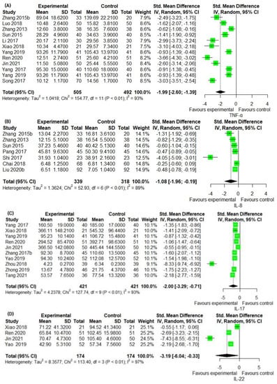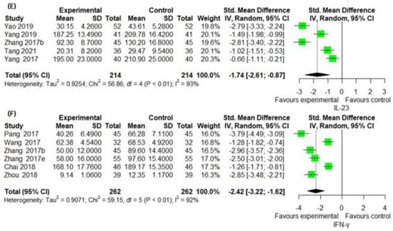 The TNF-α levels were measured in 12 studies. TNF-α levels in the IM group were significantly lower than in the CM control (12 trials, n = 997; SMD: −1.9948; 95% CI: −2.5964–−1.3932; p < 0.0001, heterogeneity chi-square = 154.77, df = 11, I2 = 92.9%; p = 0.3361; Figure 6A). IM remarkably decreased IL-8 levels compared to the CM control (seven trials, n = 657; SMD: −1.0752; 95% CI: −1.9647 to −0.1856; p = 0.0178, heterogeneity chi-square = 52.93, df = 6, I2 = 92.9%; p < 0.0001; Figure 6B). In the ten studies comparing the effect of IM with that of the CM control, IM significantly decreased IL-17 levels compared to the CM control (10 trials, n = 842; SMD: −2.0009; 95% CI: −3.2927 to −0.7091; p = 0.0024, heterogeneity chi-square = 127.74, df = 9, I2 = 93.0%; p < 0.0001; Figure 6C). The effect of IM on IL-22 was reported in four studies. A significant improvement in IL-22 by IM was identified by the CM control (four trials, n = 348; SMD: −3.1874; 95% CI: −6.0441 to −0.3307; p = 0.0288, heterogeneity chi-square = 113.40, df = 3, I2 = 97.4%; p < 0.0001; Figure 6D). IL-23 was reported in five studies. The reduction in IL-23 was significantly greater in the IM group than in the CM control (five trials, n = 428; SMD: −1.7398; 95% CI: −2.6139 to −0.8657; p < 0.0001, heterogeneity chi-square = 56.86, df = 4, I2 = 93.0%; p < 0.0001; Figure 6E). IFN-γ levels were reported in six studies. Compared with CM controls, IM significantly decreased IFN-γ levels (six trials, n = 524; SMD: −2.4211; 95% CI: −3.2187 to −1.6235; p < 0.0001, heterogeneity chi-square = 59.15, df = 5, I2 = 91.5%; p < 0.0001; Figure 6F).