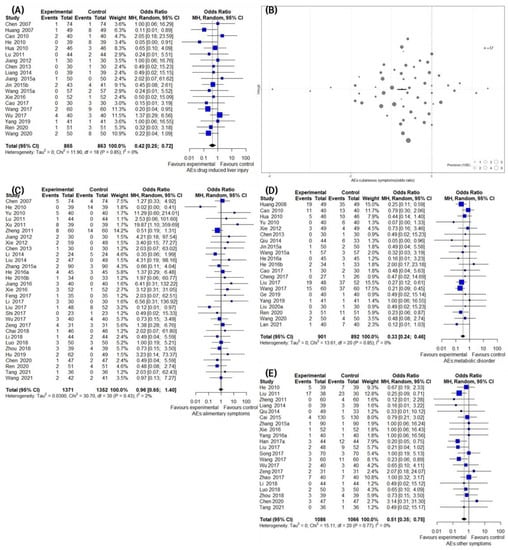 A meta-analysis of 19 studies showed that IM significantly reduced the incidence of drug-induced liver injury compared to the CM control (19 trials, n = 1728; OR: 0.4219; 95% CI: 0.2482–0.7170; p = 0.0014, heterogeneity chi-square =11.90, df = 18, I2 = 0%; p = 0.8523; Figure 7A). The pooled results of 31 studies comparing IM and CM controls suggested that the incidence of AEs was significantly reduced by IM administration. A total of 57 trials evaluated the effect of IM on reducing the incidence rate of cutaneous AEs compared to the CM control. The meta-analysis revealed a significant reducing effect of IM on AEs (57 trials, n = 2723; OR: 0.3578; 95% CI: 0.2687 to 0.4763; p < 0.0001, heterogeneity chi-square = 205.79, df = 56, I2 = 72.8%; p < 0.0001; Figure 7B). The incidence rate of alimentary AEs in IM was similar to that of the CM controls, and there was no statistically significant difference between the two groups, according to a meta-analysis (31 trials, n =2723; OR: 0.9552; 95% CI: 0.6516 to 1.4002; p = 0.8143, heterogeneity chi-square = 30.70, df = 30, I2 = 2.3%; p = 0.4305; Figure 7C). In contrast, the pooled results of 21 studies comparing IM and the CM control suggested that the incidence of metabolic AEs was significantly reduced by IM (21 trials, n = 1793; OR: 0.3288; 95% CI: 0.2369–0.4562; p < 0.0001, heterogeneity chi-square = 13.61, df = 20, I2 = 0%; p = 0.8497; Figure 7D). In the 21 studies comparing the effect of IM with the CM control, IM significantly decreased the incidence rate compared to the CM control (21 trials, n = 2152; OR: 0.5098; 95% CI: 0.3488–0.7450; p = 0.0005, heterogeneity chi-square = 15.11, df = 20, I2 = 0%; p = 0.7701; Figure 7E).