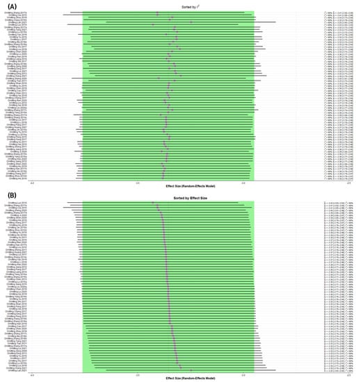 In addition to the forest plot, a drapery plot was used to better represent the effect size in this study, rather than relying solely on the primary outcome synthesis data with p < 0.05 as the level of significance [70]. Meanwhile, this study combined much more data than the previous meta-analysis. Forest plots cannot effectively represent such enormous amounts of data. After considering the results of more than 50 studies, an orchard plot was chosen to display the data instead of a forest plot [71].