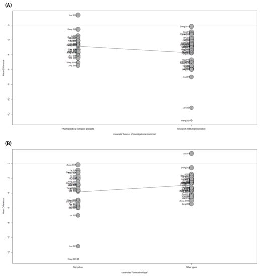 Bubble plot of the meta-regression analysis for (A) source of investigational medicine and (B) formulation type.