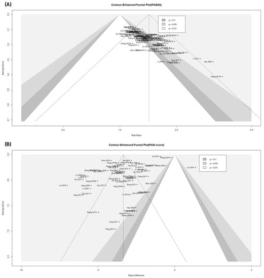 Considerable heterogeneity was found in the synthesis of the trial data for PASI scores between the two primary outcomes of this study. In this respect, trials estimated to be potential outliers were also observed in the drapery plot. To ascertain whether particular research matching these outliers was the cause of heterogeneity, a sensitivity analysis using the leave-one-out method was performed. Sensitivity analysis revealed that no single study’s omission considerably affected the change in heterogeneity (Figure 8A,B).