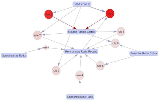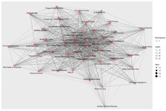 By evaluating the power of specific materials on the association between frequently prescribed EAHMs, centrality was used to discover EAHM with relatively greater influence. The eigenvector centrality scale was used to analyze the association between each of the concurrently administered herbs.