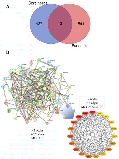 A network pharmacology analysis was performed to explore the anti-inflammatory mechanism of core herbs derived through the above data mining. The chemical ingredients in herbs were obtained from the TCMSP (Traditional Chinese medicine systems pharmacology database and analysis platform, https://therbsp-e.com/), TCMID (Traditional Chinese Medicine integrative database for herb molecular mechanism analysis, http://bidd.group/TCMID/), HERB (a high-throughput experiment-and reference-guided database of traditional Chinese medicine, http://herb.ac.cn/), and ETCM (an encyclopedia of traditional Chinese medicine, http://www.tcmip.cn/ETCM/) databases [77,78,79,80]. In this study, compounds with an oral bioavailability (OB) of 20% and a drug-like (DL) index of 0.1 were first screened according to the information provided by the TCMSP DB, and then a potential compound was finally selected by performing a second round of absorption, distribution, metabolism, and excretion (ADME) prediction using the SwissADME platform (http://www.swissadme.ch/). In the SwissADME platform, compounds were selected if at least three of the five ADME rules of Lipsinski, Ghose, Veber, Egan, and Muegge were evaluated as “yes” [81]. Potential target genes of selected active compounds were predicted by the SwissTargetPrediction platform (http://www.swisstargetprediction.ch) in the “Homo sapiens” setting and selected by the “Probability ≥ 0.1” criterion [82]. Using the “Homo sapiens” species filter in the Uniprot database (http://www.uniprot.org), the target information for active substances was standardized. Data on psoriasis-related target genes were retrieved from the GeneCards database (http://www.genecards.org) with “psoriasis vulgaris” as the keyword. For targets in GeneCards, only those with a score ≥ 10 were screened [83].