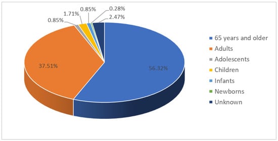 Regarding the clinical outcome of the suspected adverse reaction, 680 cases (65%) recovered, 99 (13%) were recovering, 76 (7%) did not recover, 28 (3%) recovered with sequelae, and in 23 cases (2%), death occurred; in 138 cases (13%), no information on clinical outcome was recorded. Out of the 23 cases with a fatal outcome, 56.53% were female and 39.13% male. Regarding age, 86.9% of these reports belong to the 65 years and older age group (Supplementary Materials Table S3). Data regarding drug withdrawal and clinical outcome showed that in 1393 cases (73.08%), the drug was withdrawn, and the patient improved. In 48 (2.52%), the drug was withdrawn but the reaction did not improve. In 50 (2.62%) of them, the patient improved by keeping the drug but with timely treatment for the reaction caused, and in 20 (1.05%), the drug was not withdrawn and did not improve. Also, in 70 cases (3.67%), the clinical evolution was fatal or irreversible. In 325 cases (17.05%), no information was collected in this regard.