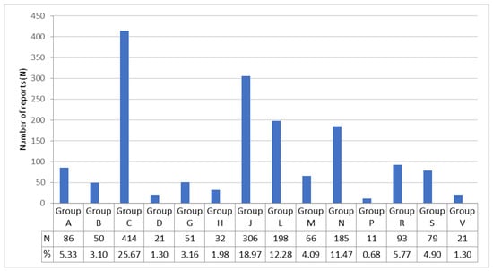 The analysis of the drugs in the remaining ATC Groups shows a very uneven distribution, with few reports for each drug. Only salbutamol (ATC R03AC02) stands out with 21 reports (1.3%) (Supplementary Table S1).