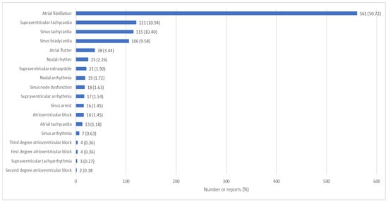 Regarding the reported arrhythmias, 561 (50.72%) were atrial fibrillation, 121 (10.94%) supraventricular tachycardia, 115 (10.40%) sinus tachycardia, 106 (9.58%) sinus bradycardia, 38 (3.44%) atrial flutter, 25 (2.26%) nodal rhythm, 21 (1.90%) supraventricular extrasystole, 19 (1.72%) nodal arrhythmia, 18 (1.63%) sinus dysfunction, 17 (1.54%) supraventricular arrhythmia, 16 (1.45%) AV block, 16 (1.45%) sinus arrest, 13 (1.18%) atrial tachycardia, 7 (0.63%) sinus arrhythmia, 4 (0.36) third degree AV block, 4 (0.36) first degree AV block, 3 (0.27) supraventricular tachyarrhythmia and 2 (0.18) second degree AV block, as shown in Figure 3 (detailed information is given in Supplementary Table S2).