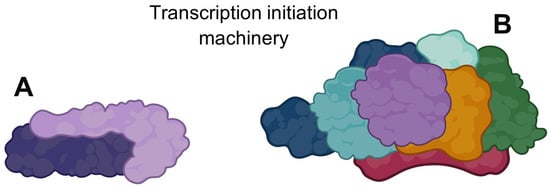 Transcription initiation machinery. (A) G. lamblia, only two proteins that form the TBP-TAF complex SL1 are reported. (B) TBP-TAF complex SL1 of higher eukaryotes, made up of seven proteins. Created with BioRender.com.