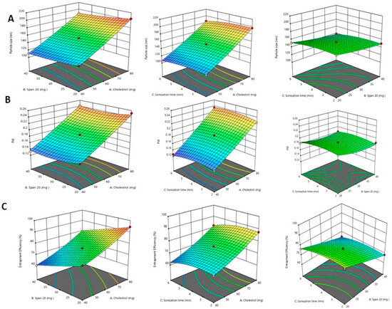 A 3D response surface plot showing the effect of independent variables on (A) vesicle size, (B) PDI, and (C) %EE.