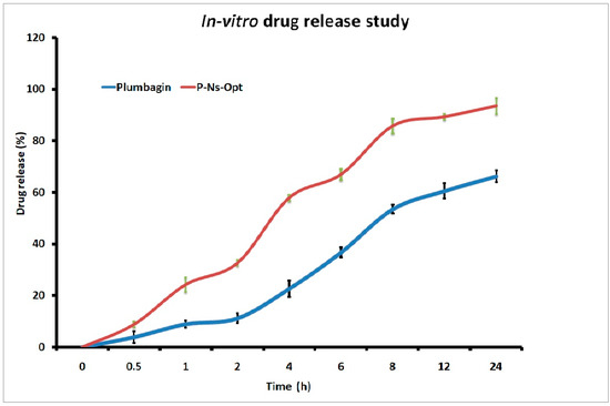 P-Ns-Opt and plumbagin dispersion were compared on the basis of the drug release behavior (Figure 5). After 6 h of the trial, 36.6% of the cumulative release of plumbagin from the plumbagin suspension was seen to be rapidly released. After 24 h, a release rate of 66.17% was seen. While P-Ns-Opt demonstrated prolonged drug release, it also displayed an initial rapid release that might have been brought on by the unentrapped drug. Later, P-Ns-Opt displayed a plumbagin release rate of 88.19% at 12 h and a release rate of 93.04% at 24 h. The plumbagin was first released in bursts over a few hours, as shown in Figure 5, and the release was then continued for up to 24 h. By replenishing the receiver medium, the new buffer was employed to preserve the sink condition; however, this cannot entirely replicate the sink condition. As a result, it might not be able to completely remove pharmaceuticals from the matrix.