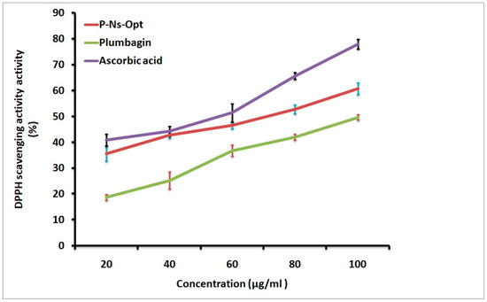 DPPH scavenging activity of Ascorbic acid, P-Ns-Opt, and plumbagin.