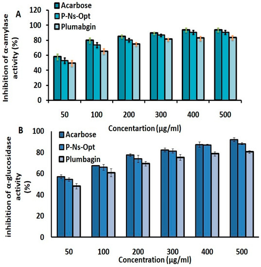 Inhibition of (A) α-amylase and (B) α-glucosidase activity of plumbagin and P-Ns-Opt.