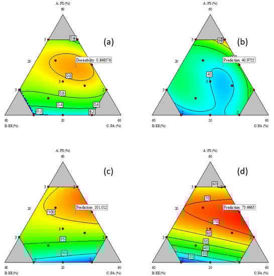 The %R2 data was in the range of 29.4% to 74.8% (Table 1). It was increased by higher FS and PA contents (FS, coefficient 110.9 and PA, coefficient 86.5, Table 2), and decreased by drug–excipient interactions, specifically interactions of FS with PA (AC, coefficient −186.6) and FS with EE (AB, coefficient −22.9 and AB(A-B) coefficient −250.7). Conversely, interactions between the excipients, EE and PA, increased the %R2 (BC, coefficient −7.5 and BC(B-C), coefficient 177.1). The contour plot for %R2 (Figure 1b) shows a narrow region (blue) of relatively low %R2 (below 40%) when the FS content in the FTM increased to approximately 40%.