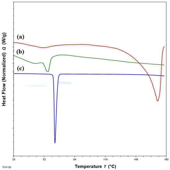 DSC thermograms of (a) flucloxacillin sodium (FS, red); (b) Eudragit EPO (EE, green); (c) palmitic acid (PA, blue) showing the peak temperatures of the endotherm of FS, EE and PA.