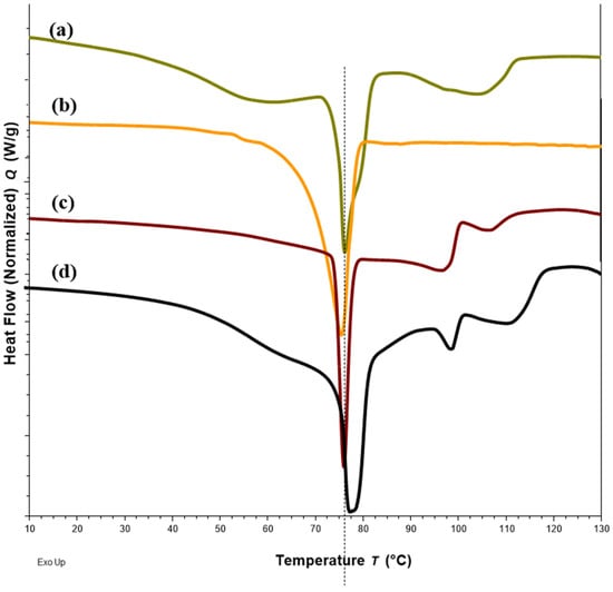 DSC thermograms of Sample 18 with FS-EE-PA at 20:50:30 w/w/w (a), Sample 20 with FS-EE-PA at 30:20:50 w/w/w (b), Sample 22 with FS-EE-PA at 50:20:30 w/w/w (c) and FTM-ECR with FS: EE: PA at 42:33:25 w/w/w (d). FTM-ECR = fabricated at equimolar component ratio, FS = flucloxacillin sodium, EE = Eudragit EPO and PA = palmitic acid.