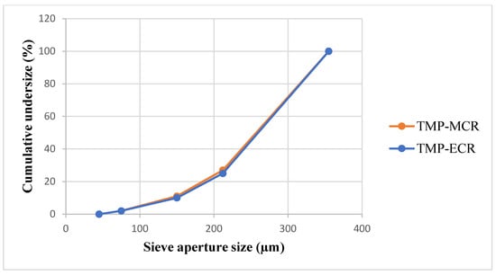 Particle size distribution for FTM-MCR (20 g, n = 1) and FTM-ECR (20 g, n = 1) samples. FTM samples were milled using a pestle and mortar and the particle size was analysed by the sieving method.