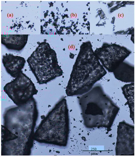 Appearance of (a) flucloxacillin sodium; (b) Eudragit EPO; (c) palmitic acid; (d) milled FTM-ECR under a light microscope, magnification 400×; Nikon Eclipse Ti2.