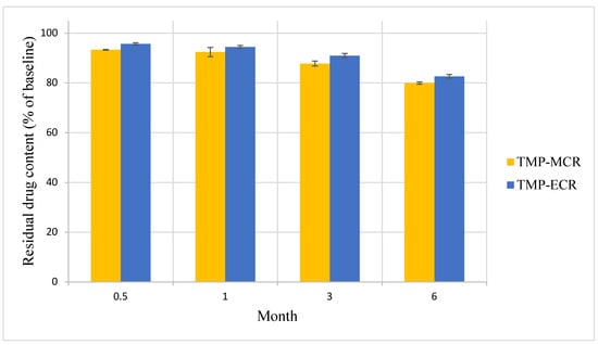 Stability of FTM-MCR and FTM-ECR samples stored at 40 °C and relative humidity of 44 to 52%. Residual flucloxacillin sodium content in the FTM was determined by HPLC analysis at the specified duration of storage and expressed as a percent of baseline content. Data represent mean ± SD (n = 3).