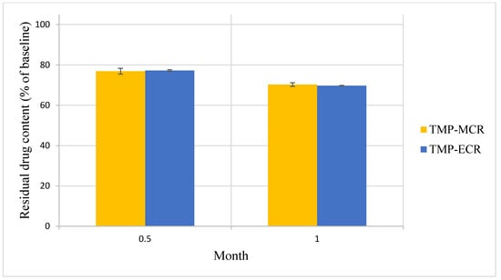 There was no statistically significant difference in the Day 0 baseline drug content between the two FTM samples (p = 0.041, n = 3); the FS content was 39.3 ± 1.5 and 39.9 ± 0.4% w/w, respectively, for FTM-MCR and FTM-ECR. The two FTM samples also showed comparable chemical stability profiles. At 6 months of storage at ambient conditions, the residual FS content as a percent of baseline for the FTM-MCR was 79.9 ± 1.2%, while that for the FTM-ECR was not statistically different at 82.6 ± 1.9% (p = 0.057, 95% CI) (Figure 7). When stored at the accelerated stability evaluation condition of 40 °C, both FTM samples were more unstable, but still showing comparable rates of drug loss of more than 20% after 14 days and more than 30% after 1 month (Figure 8).