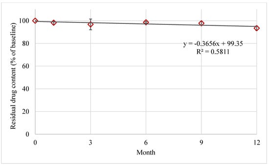 Stability of FTM-ECR samples stored at ambient temperature under reduced relative humidity of 23%. Residual flucloxacillin sodium content in the FTM was determined by HPLC analysis at the specified duration of storage and expressed as a percent of baseline content. Data represent mean ± SD (n = 3). The black solid line represents a linear regression line.