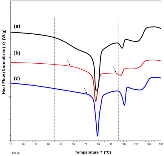 DSC thermograms for (a) FTM-ECR samples at Day 0; (b) after 3 months storage at ambient temperature and relative humidity (RH) of 57 to 79%; (c) at ambient temperature under reduced RH of 23%. Black dash lines show the onset of endotherms for the FTM-ECR at Day 0, with arrows indicating a shift in onset for endotherms after 3 months storage.